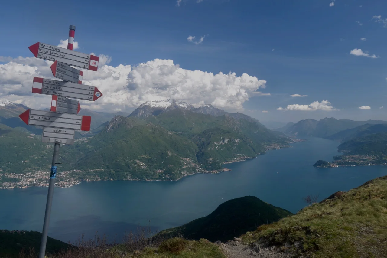 This is a spectacular hike which we did in May 2017. Here is one of the views of the Lake from 2/3 of the way to the top. Ahead is the part of Lake Como which goes down to Lecco, with Bellagio on the tip in the middle distance